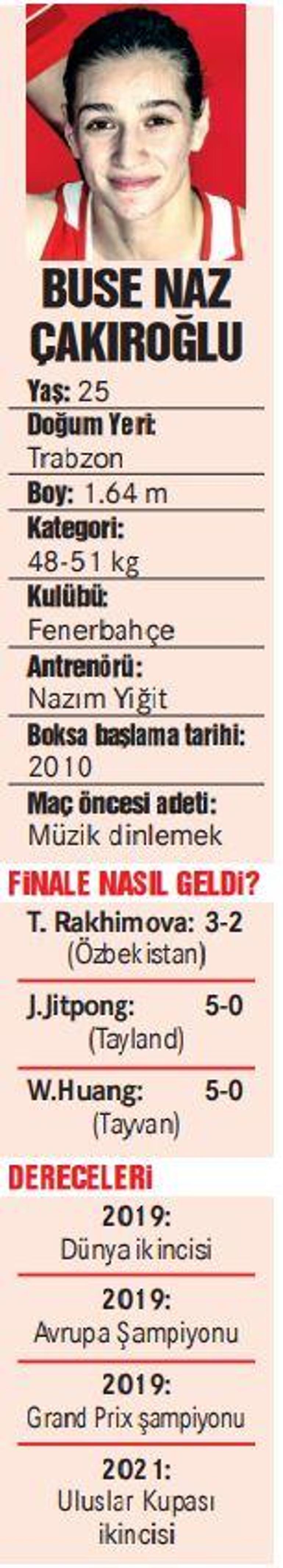 Buse naz çakıroğlu (26 mayıs 1996, trabzon), türk boksör. 2020 tokyo olimpiyat oyunları'nda kadınlar boksta 51 kiloda buse naz çakıroğlu, finale çıktı. Buse naz çakıroğlu yarı finale yükseldi ve madalyayı garantiledi. 2021 yılında tokyo olimpiyatları'na katılma kotası elde etti. Milli boksörümüz buse naz çakıroğlu, özbek rakibini devirerek tokyo olimpiyatları'nda çeyrek finale yükseldi.